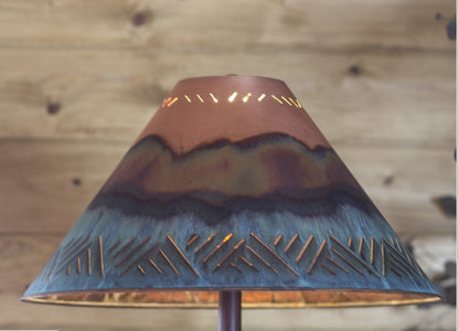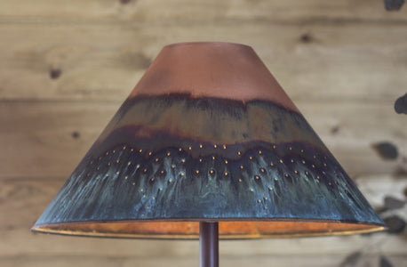 Our lamp shades are solid copper with hand-crimped edges and wire-reinforced framework to ensure long lasting quality. Each shade is handcrafted when ordered making it a one of a kind family heirloom. A Finial and Harp is included with each shade.